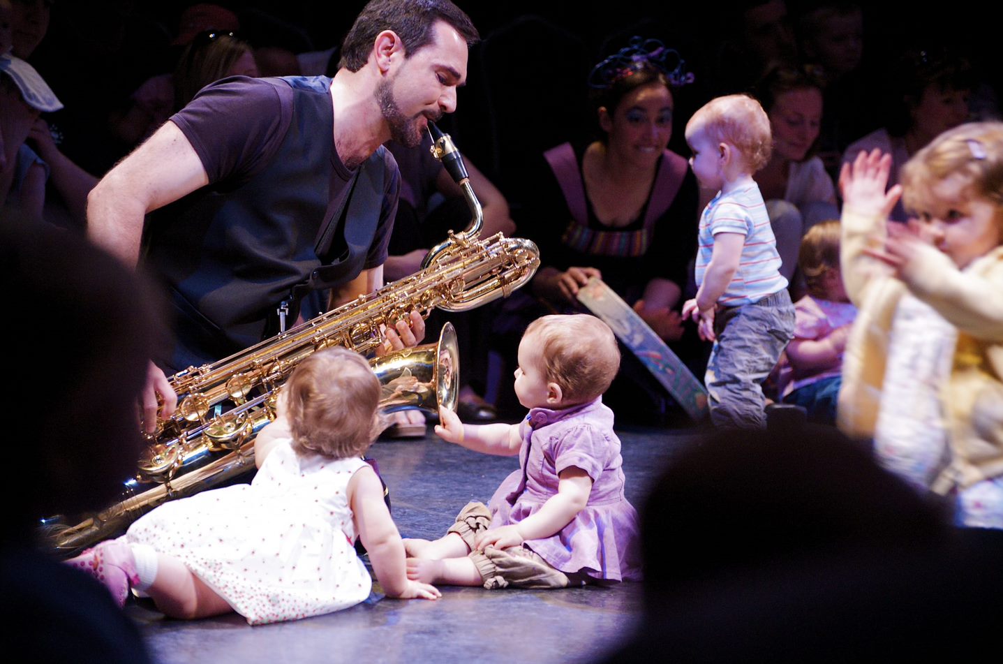 Quem os bebés gostam de ver dançar é a bailarina Inesa. O Paulo, com os outros músicos, prefere cantar e tocar para ver os duetos dos bebés com a bailarina. Mas a Clara Leão um dia, ao espreitar os Concertos para Bebés, imaginou que todos poderiam dançar naquela arena de fraldas. Olhou com mais atenção os dedos dos saxofonistas e dos bebés, deixou-se embalar pelo fole do acordeão enquanto as mães embalavam o mais precioso dos públicos, e nasceu um concerto novo. Quem vai dançar afinal?