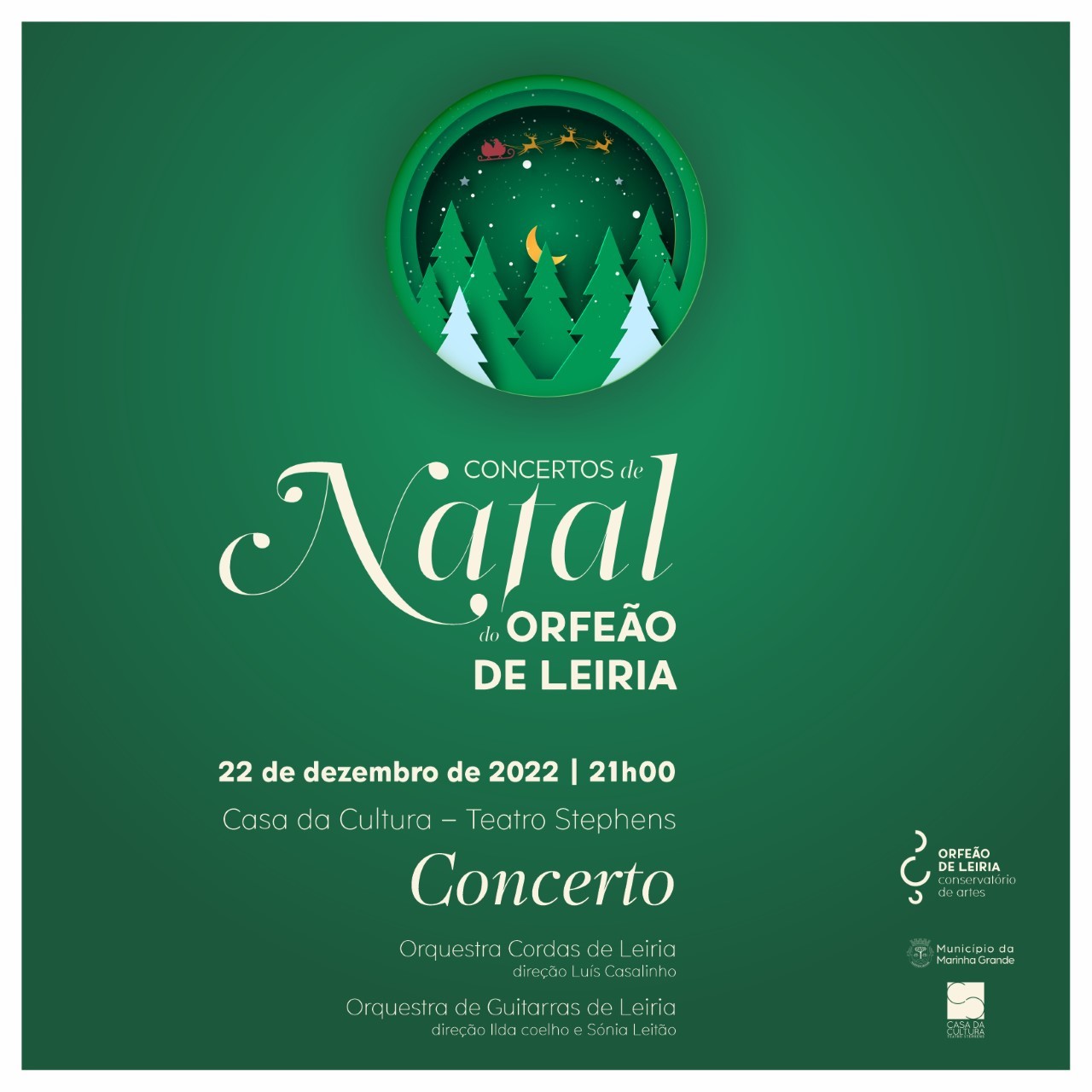Realiza-se, a 22 de dezembro de 2022, pelas 21h, na Casa da Cultura Teatro Stephens, um Concerto de Natal do Orfeão de Leiria. Irão fazer parte do concerto a Orquestra de Cordas de Leiria, com direção de Luís Casalinho, e a Orquestra de Guitarras de Leiria, com direção de Ilda Coelho e Sónia Leitão.
