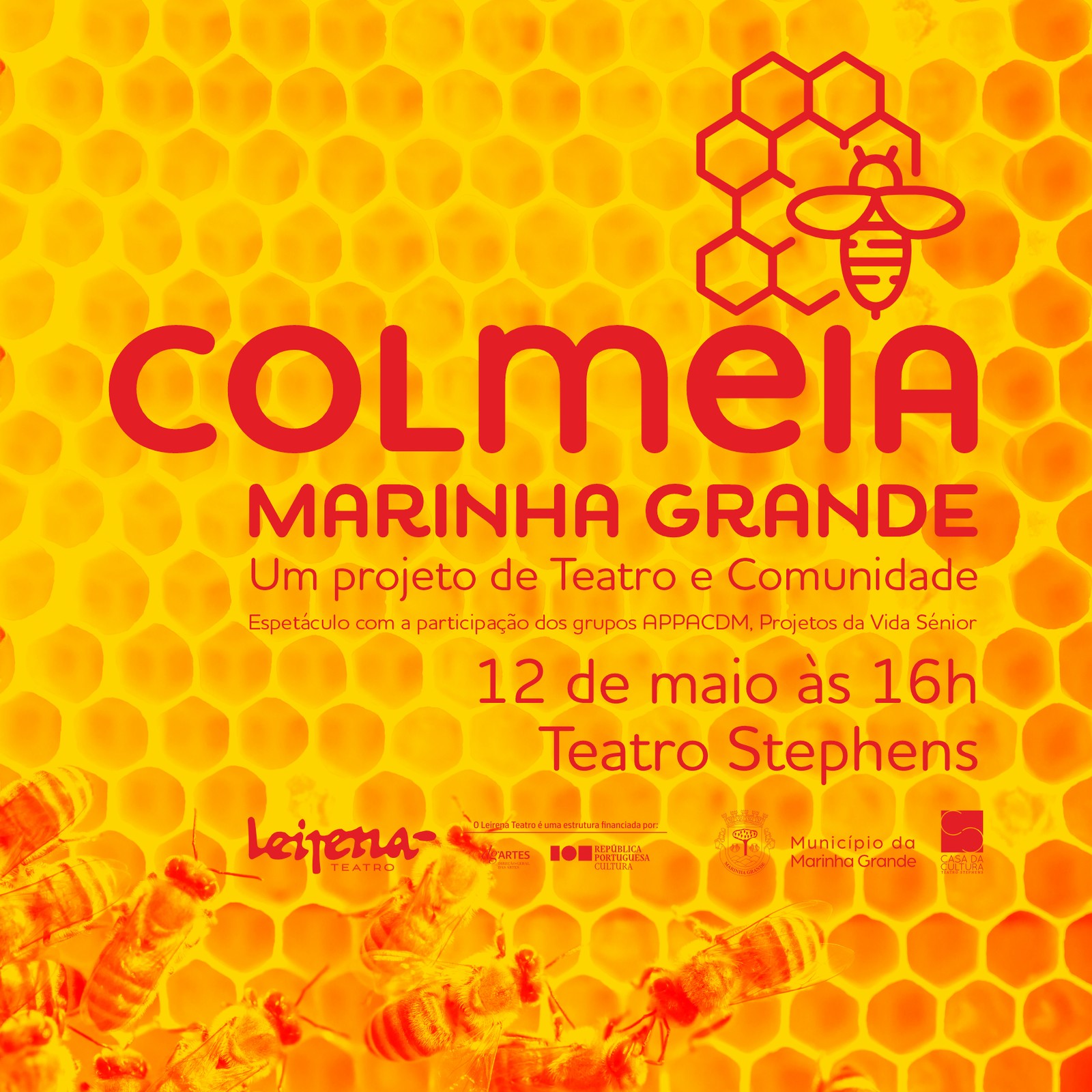 O Teatro Stephens, na Marinha Grande, exibe o espetáculo de teatro comunitário “Colmeia”, pela companhia Leirena, que conta com a participação e atuação dos grupos de trabalho da APPACDM e da associação Projetos de Vida Sénior, no dia 12 de maio, pelas 16h00, cuja entrada é gratuita.