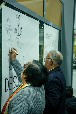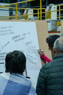 Na mesa estiveram também 6 cartazes. Cada um deles começou com uma palavra diferente escrita ao centro, sobre a qual discutimos e conversámos, registando à sua volta as ideias e as perguntas que foram surgindo, como um mapa.