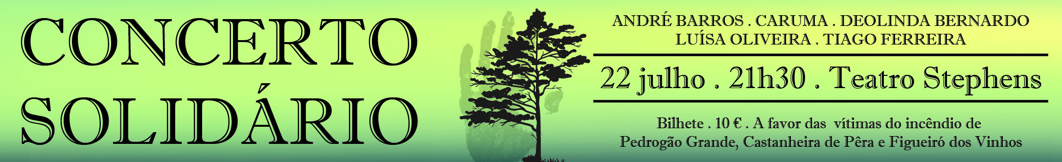 A Casa da Cultura Teatro Stephens, na Marinha Grande, é palco da realização do Concerto Solidário, que conta com a atuação de Caruma, Luísa Oliveira, Deolinda Bernardo, André Barros e Tiago Ferreira, a favor das vítimas do incêndio de Pedrógão Grande, Castanheira de Pêra e Figueiró dos Vinhos, no dia 22 de julho (sábado), pelas 21h30.